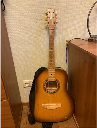 Эту гитару мне родители подарили на новый 2004 год. На момент получения этого подарка мне было 12 лет. Как сейчас вижу – оптимальный момент для человека без музыкального образования. Папа именно так и рассудил: по его мнению, владение инструментом могло бы помочь мне для социализации, ведь в любой молодежной компании человек с гитарой вызывает интерес, уважение парней, симпатию девушек, а что еще может быть важно в этом возрасте? Меня и самого эта идея заинтересовала, и я освоил некоторые базовые аккорды, даже стоически стирал пальцы о гриф, пытаясь взять барре (в основном фа, для остального есть открытые базовые аккорды). Гитара производства Украины была для этого неплоха: возможность регулировки грифа так, чтобы струны были не очень высоко, сам гриф достаточно узкий по сравнению с классической гитарой, ближе к электрогитарному, плюс на ней сразу же стояли металлические струны, сразу готовящие руки к року, нейлон бы тут был неуместен. Не могу сказать, что я добился сколь-нибудь значимых успехов в освоении инструмента на этом уровне, ни разу с ней нигде не выступал, но кое в чем она помогла – выучил основные аккорды, и даже кое-что узнал о загадочном блюзовом квадрате. Что важнее, сам факт моего знакомства с гитарой открыл возможности для чего-то более интересного. К слову, гитара по сей день при мне, хранится за городом в доме родителей, даже пытался поставить на нее новые струны, но играть сложновато – надо отдать мастеру, поработать с ладами, чтобы не калечили руки.