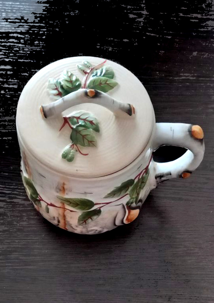 Большая фаянсовая кружка, слегка щербатая, кое-где на поверхности есть еле заметные трещины. Кружка в виде пенька березы, бока разрисованы черными и охристыми полосками-трещинами, березовая кора: шероховатая, неровная поверхность. Венчает кружку крышечка, на которой — несколько зеленых березовых листочков. Сбоку кружки — ручка, опять же непростая гладкая ручка, а такой вот изогнутый сучок с живописными небольшими выпуклыми желтоватыми наростами.