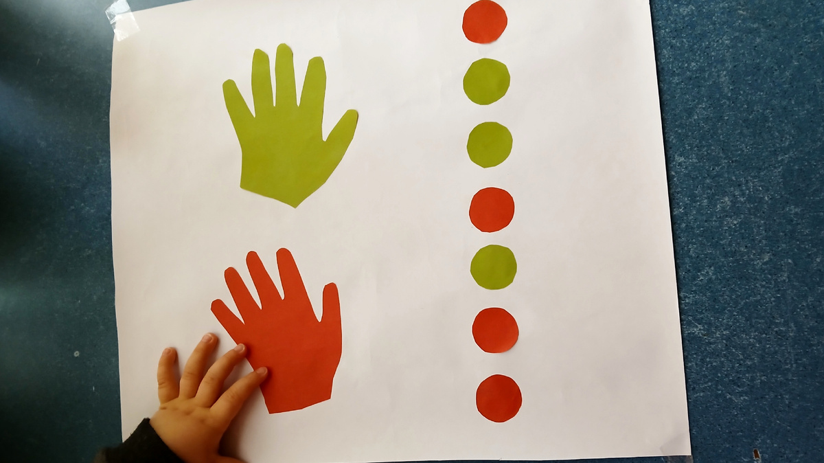 Указательным пальчиком левой руки ребёнок "нажимает" на кружок, в это же время ладошку левой руки кладёт на изображение ладошки цвета, соответствующего кружку.