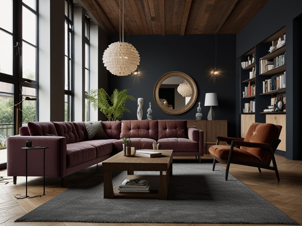 Цветовая палитра тяготеет к серым, кирпичным, графитовым и древесным оттенкам. Мягкая мебель обивается кожей, тканями с эффектом потёртости или грубой текстурой. Лофт не стремится быть уютным в классическом понимании — его цель в свободе, характере и атмосфере «творческого беспорядка».