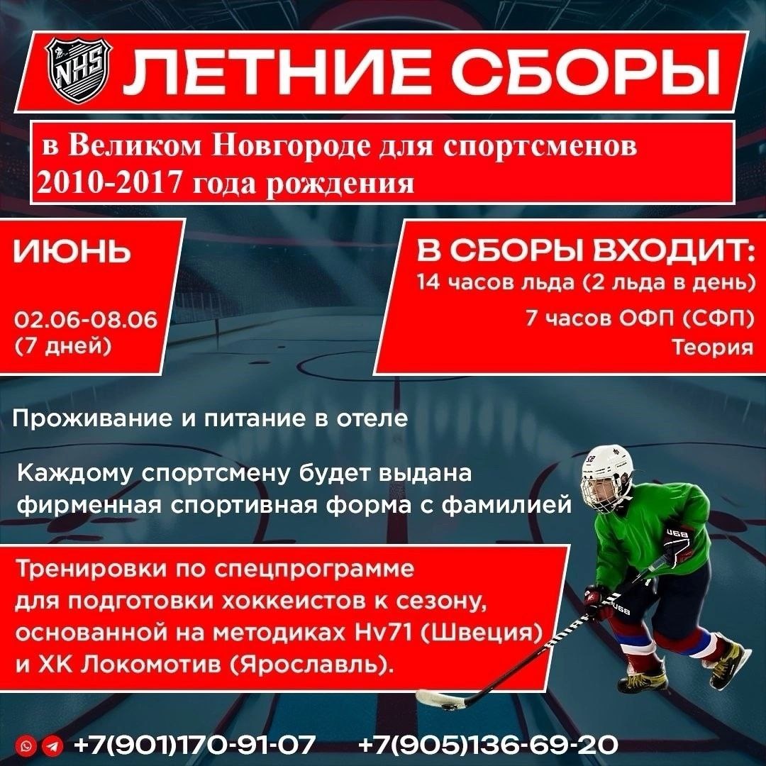 New Hockey Stars (NHS) приглашает игроков 2010-2017 года рождения на летние хоккейные сборы. Дата проведения: 02-08 июня 2025 года (7 полноценных дней) Место проведения: г. Великий Новгород, СШ "Спорт-индустрия" В сборы входит: 14 часов льда (2 льда в день); 12 часов ОФП (СФП); Ежедневная теория. Проживание и питание в отеле. Возможно участие в сборах без проживания и питания. Каждому спортсмену будет выдана фирменная спортивная форма и джерси. Тренировки по спецпрограмме для подготовки хоккеистов к сезону, основанной на методиках таких команд как: Hv71 (Швеция), ХК Локомотив (Ярославль). Более подробная информация: https://kidshockey.ru/viewtopic.php?f=50&t=89758