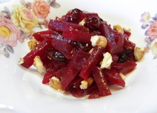 Простейший по составляющим, но очень вкусный и полезный салат для красоты и здоровья. Захотелось мне какого-нибудь лёгкого свекольного салата, запекла свёклу и решила поэкспериментировать. Посмотрела что есть дома интересного и собрала такой вот незамысловатый салат. И так он мне понравился, что я готовила его всю зиму с разными заправками. И сюда принесла. На 1 порцию - 1 средняя свёкла - 1/2-1ст.л. вяленой клюквы - 3-4 половинки грецкого ореха - Соль - Чеснок по желанию (мне понравилось с чесночной ноткой, добавляла в заправку чуть-чуть пропущенного через пресс чеснока или заправляла сванской солью) 1) Растительное масло (у меня смесь горчичного и кунжутного) 2) Сметана 3) Греческий йогурт 4) Майонез Я пробовала со всеми этими заправками и мне понравились все, даже не знаю какая больше. Свёклу отварить или запечь, почистить и порезать брусочками или кубиками. Переложить в салатник, добавить вяленую клюкву, грецкие орехи, соль и заправку, перемешать. Клюква сладкая, не кислая. У меня