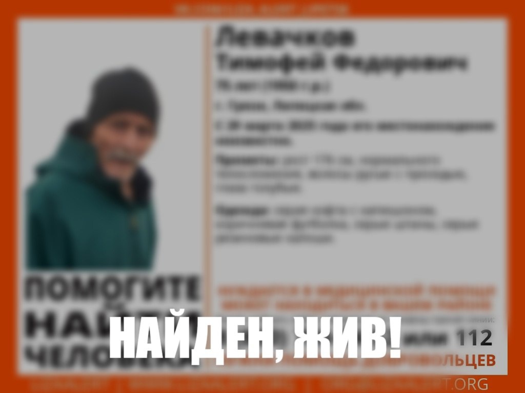 В Липецкой области завершились поиски 75-летнего Тимофея Федоровича Левачкова. Напомним, в минувшую субботу, 29 марта, пенсионер ушел из дома в Грязях и не вернулся. С тех пор пожилой мужчина не выходил на связь. Осложнялись поиски тем, что Тимофей Левачков нуждается в медицинской помощи. К счастью, все завершилось успешно. Почти спустя неделю волонтеры поисково-спасательного отряда «Лиза Алерт» по Липецкой области сообщили, что пенсионера нашли живым.