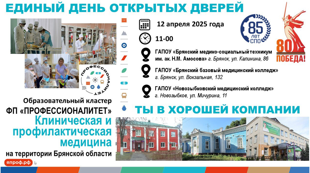 Встречи проведут в Брянском медико-социальном техникуме имени академика Н.М. Амосова, Брянском базовом медколледже, а также в Новозыбковском медицинском колледже. Гостям расскажут о преимуществах кластера «Клиническая и профилактическая медицина», о числе бюджетных мест в средне специальных учебных заведениях, образовательной программе.