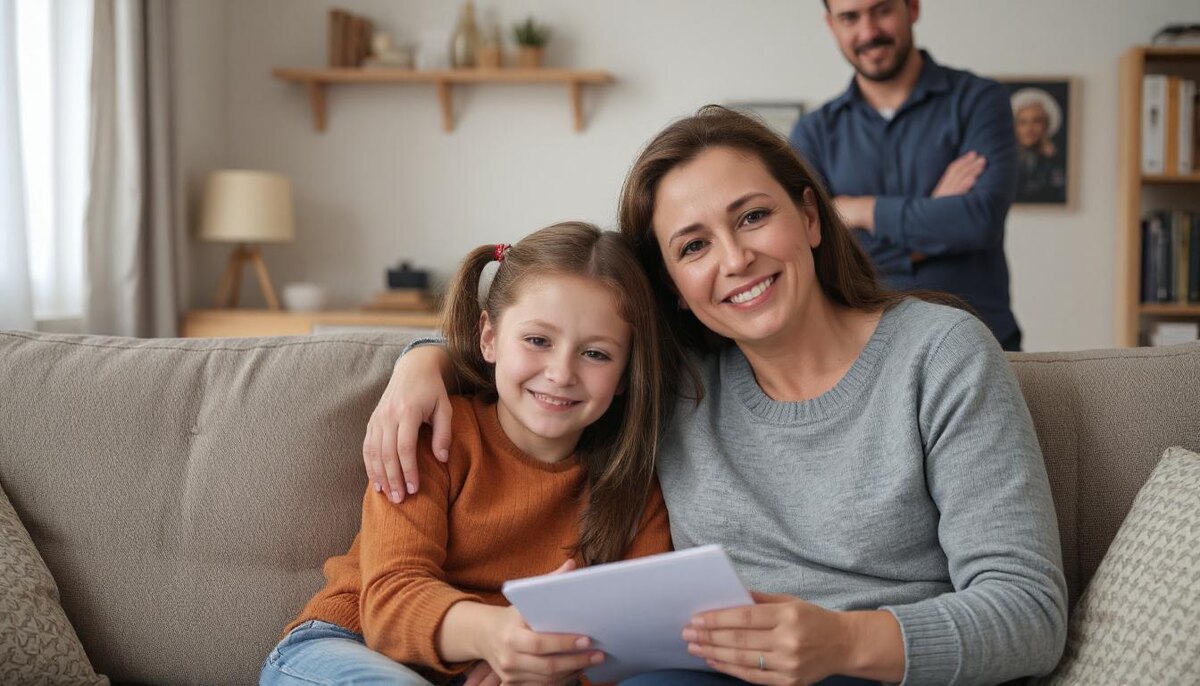 Пока Андрей мыл руки, я подвела Леру к столу: «Садись. Сейчас будем ужинать». Девочка кивнула и вытащила из рюкзака аккуратно сложенный рисунок — там были мы втроём, смешно нарисованные карандашами. Я почувствовала, как сердце защемило от нежности: у ребёнка наконец появилось место, где она могла быть собой и не бояться, что её отвергнут.