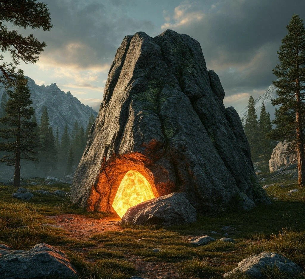 Через некоторое время впереди показалась небольшая поляна. На ней стояла огромная скала, и прямо у ее подножия Тима заметил что-то необычное. Он подошел ближе и увидел, что в скале был замурован какой-то блестящий камень. Этот камень переливался всеми цветами радуги и источал теплый свет. Подходя к нему, Тима почувствовал, как в него проникает легкое волнение, словно камень звал его к себе.