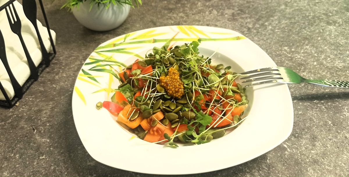 Быстрый салат с помидорами, огурцами и тыквенными семечками за 5 минут