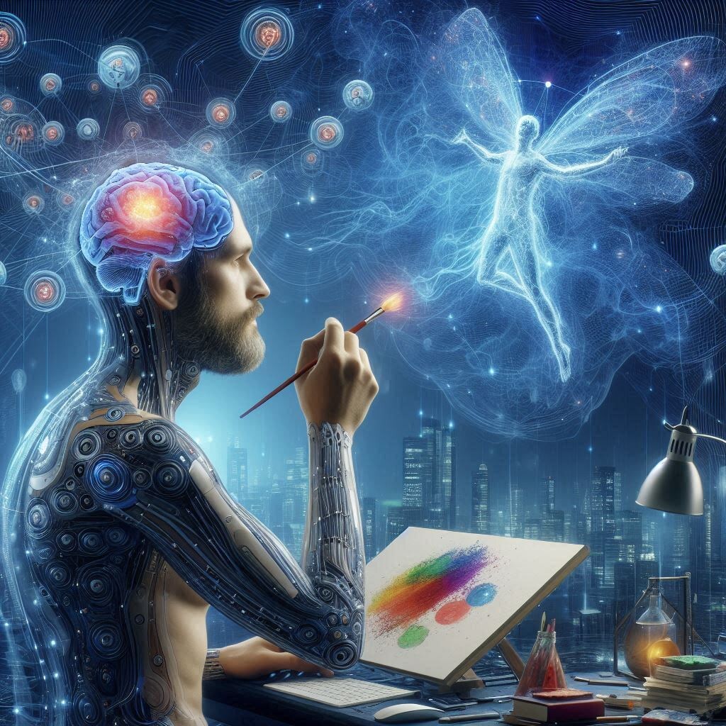 Промт : “The image of the digital artist of the future is a man with implants, connected to a neural network via a brain-computer interface. He creates a painting on a huge virtual canvas with his thoughts, while digital art elements float around him.”