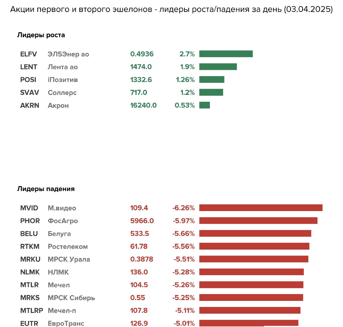 Всем привет! По итогам основной сессии 3 апреля индекс Московской биржи потерял около 2,2%. Вчера Трамп ввел ответные пошлины в отношении большинства стран Мира. Если посмотреть таблички, то пошлины составляют 50% от пошлины страны в отношении продукции из США. Забавно, что в список стран, против которых введены пошлины не включены Россия и Беларусь. Последняя скорее всего, действительно, особо ничего не поставляет в США. Но Россия поставляет удобрения. Не сильно много, но это один из рынок сбыта для Фосагро и Акрона. Не знаю насколько им это поможет. Доллар к рублю остается стабильным - курс на завтра в районе 84 руб/дол. Торговая война уже привела к падению цен на нефть до 70 дол/бар. Полагаю, что наш рынок тоже переосмыслил действия Трампа и пошел в коррекцию. Ну и конечно мирный процесс никуда не идет, поэтому от былых надежд уже мало что осталось. Таким макаром мы скоро на декабрьские минимумы приползем... Совет директоров Новабев (ех-Белуга) принял положительное решение о IPO В
