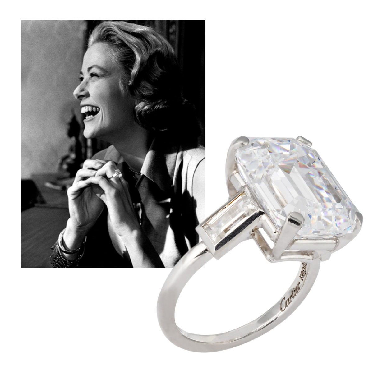 Именно бренд Cartier в 1956 году создал эталонный дизайн помолвочного кольца с 10-каратным бриллиантом в огранке изумруд, в честь помолвки для Грейс Келли от князя Монако Ренье III.