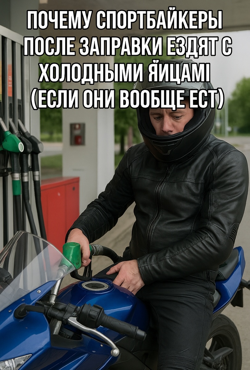 Если ты хоть раз видел мотоциклиста на спортбайке, притулившегося к баку, будто он обнимает его в последний раз, знай — этот человек, возможно, прямо сейчас борется не только с ветром, но и с ледяным ужасом в штанах. Всё дело в баке. Точнее — в бензине, который вы только что залили до полного. Горючее в подземных резервуарах АЗС всегда холодное, а если ещё и ночь, весна или осень — температура бензина может быть около +5...+10 градусов. Заливая полный бак под завязку, вы автоматически превращаете свой мотоцикл в ходячий холодильник. А где на спортбайке находится бак? Правильно, ровно между ног. И куда прижимаются все самые дорогие и чувствительные части тела при езде? Туда же. После заправки мотоциклист ещё минут 15-30 катает с ощущением, что в штанах завелась пара пингвинов. Особенно весело на дальняках или в прохладную погоду. Этот эффект даже получил в байкерской среде шуточное название — cold balls syndrome (синдром холодных яиц). Некоторые байкеры утверждают, что это зака