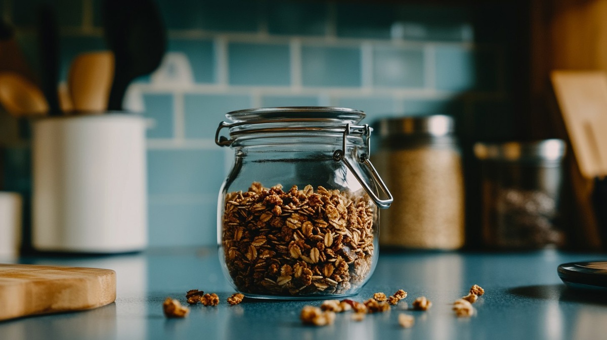 Создано на основе запроса: "High-quality photograph of granola in a transparent jar, placed on a kitchen countertop
