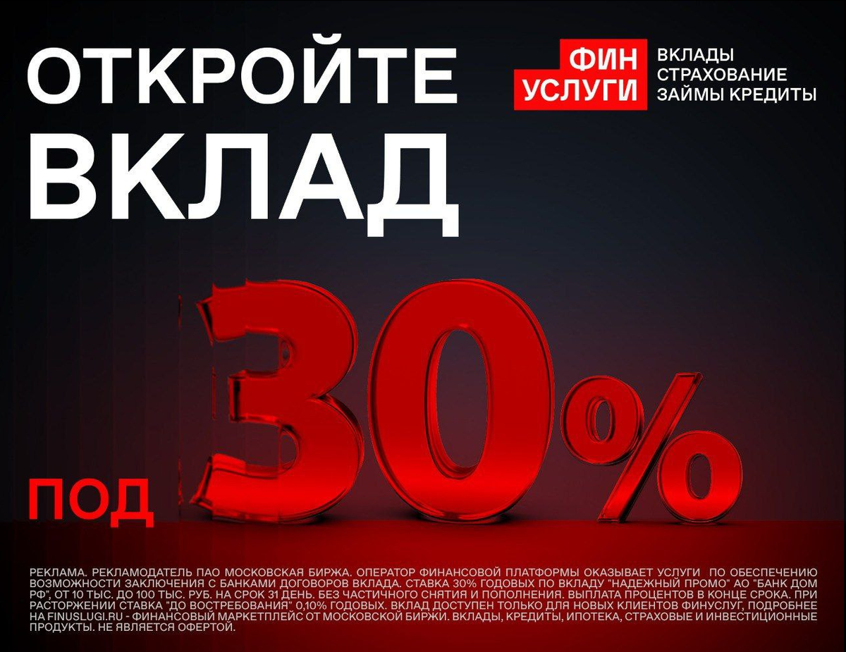 ⚡️На Финуслугах снова доступен промо-вклад: ● Только для новых клиентов Финуслуг ● Ставка: 30% годовых ● Срок: 31 день ● Сумма: от 10к до 100к ₽ ● Предложение до 30 апреля 👉 Если свободных средств больше 100 тыс. рублей, то лучше открыть вклад от: ● Только для новых клиентов Финуслуг ● Ставка: 24% годовых ● Срок: 3 месяца ● Сумма: от 10к до 1 млн ₽. Открыть вклад можно дистанционно, не выходя из дома. Для этого регистрируемся на «Финуслугах» через «Госуслуги» и подтверждаем личность через Т-ID и Alfa ID (нужно быть клиентом Альфа-банка и Т-Банка) или через встречу с представителем. После этого можно открывать вклады в любых банках. 🔥 Напомню, что действие промокода BONUS55 продлено на 2025 год 👍 Он даст до +5,5% к ставке по вкладу при открытии по ссылке. 🔸до 50% скидка на ОСАГО (промокод: FINOSAGO25) 🔸до 30% скидка на полис ипотечного страхования (промокод: IPOTEKALETO)