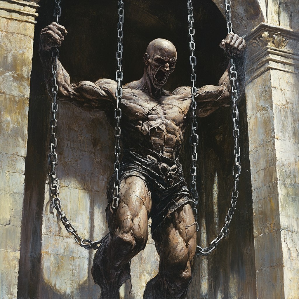 Создано на основе запроса: a fairly muscular undead prisoner, suspended by the arms by chains from a portico