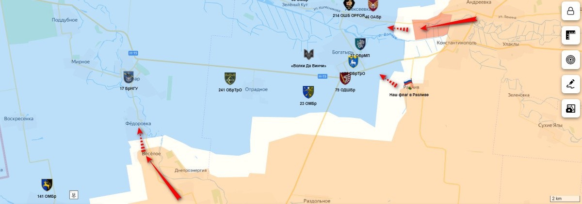 ❗️🗺После установления взводно-тактическими штурмовыми подразделениями 5-й танковой бригады 39-й армии контроля над н.п. Весёлое и начала штурма Фёдоровки на южном фланге стратегически важного на Великомихайловском направлении н.п. Комар активизировался и константинопольский отрезок.