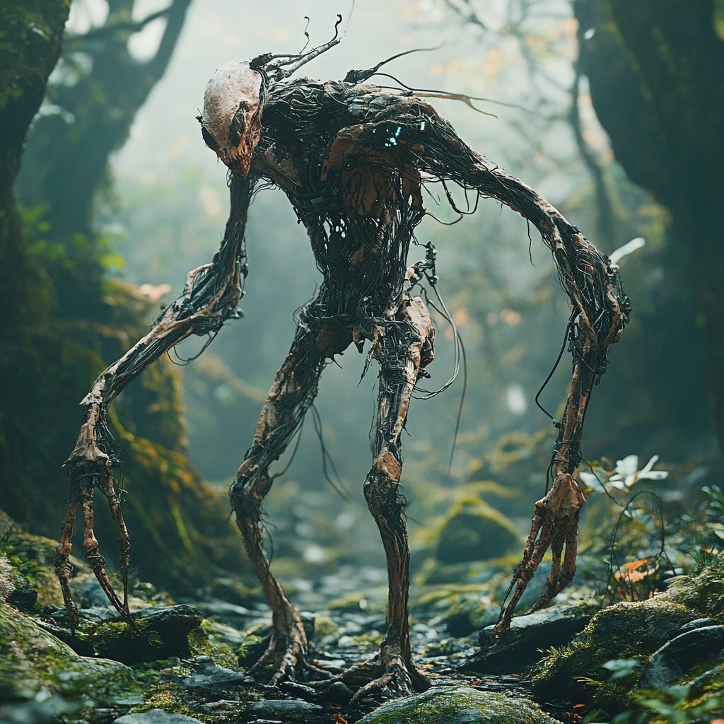Создано на основе запроса: a high quality cinematic picture of a standing creature half handsome half scary face with very long limbs and neck with electronic boots, the scene is chaotic in a forest jungle type