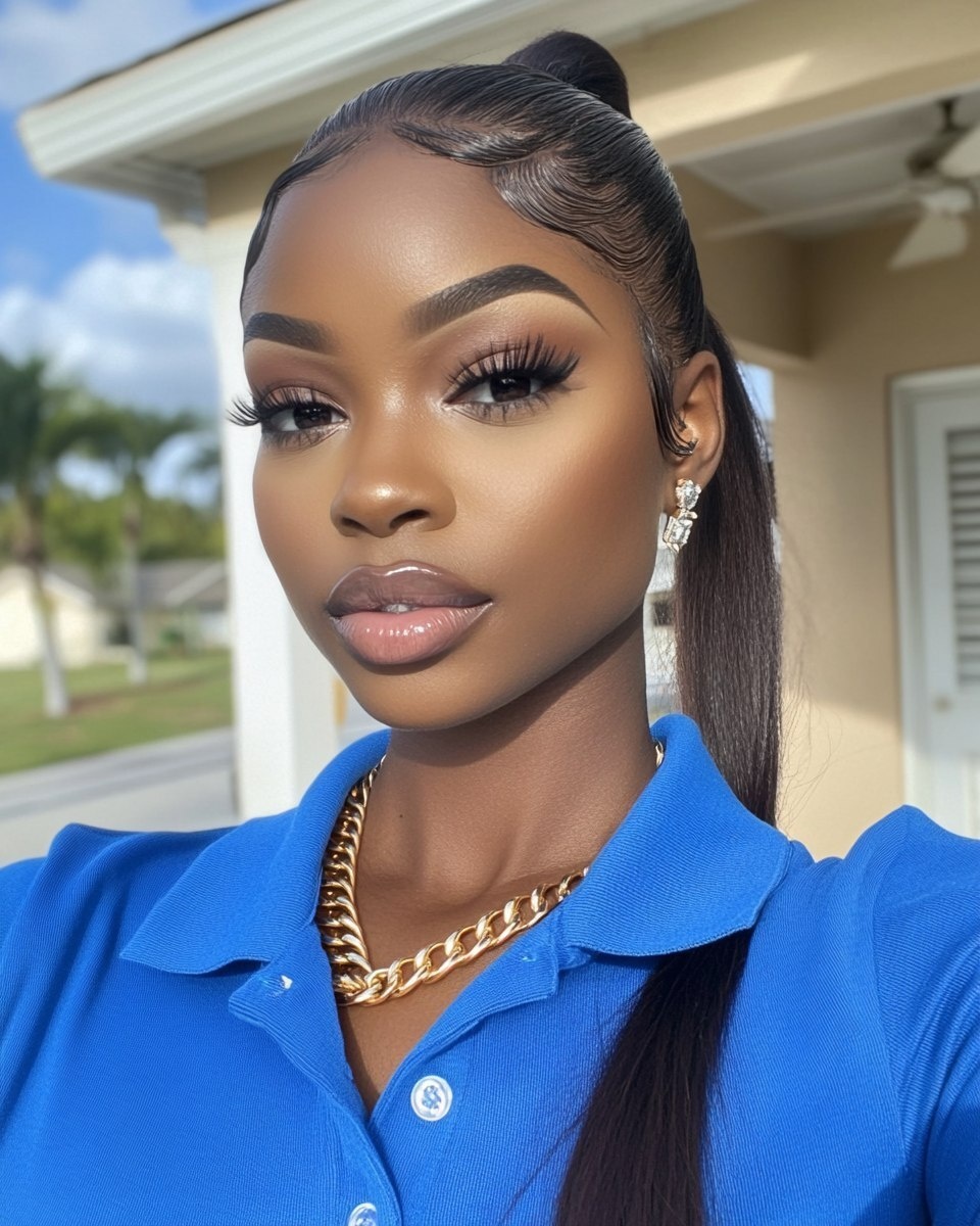 Создано на основе запроса: A Black woman with straight hair in a ponytail, wearing a blue polo shirt and a gold chain necklace, is taking a selfie outside of a house. She has on glossy lipstick and diamond earrings.