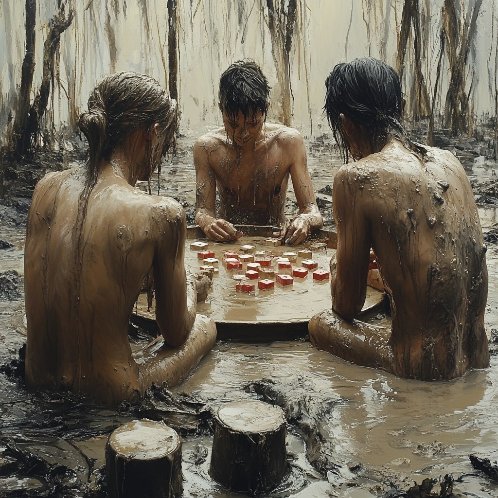 Создано на основе запроса: A group of people playing mahjong in the mud, covered in mud, Soaking in a bathtub filled with mud, there is a