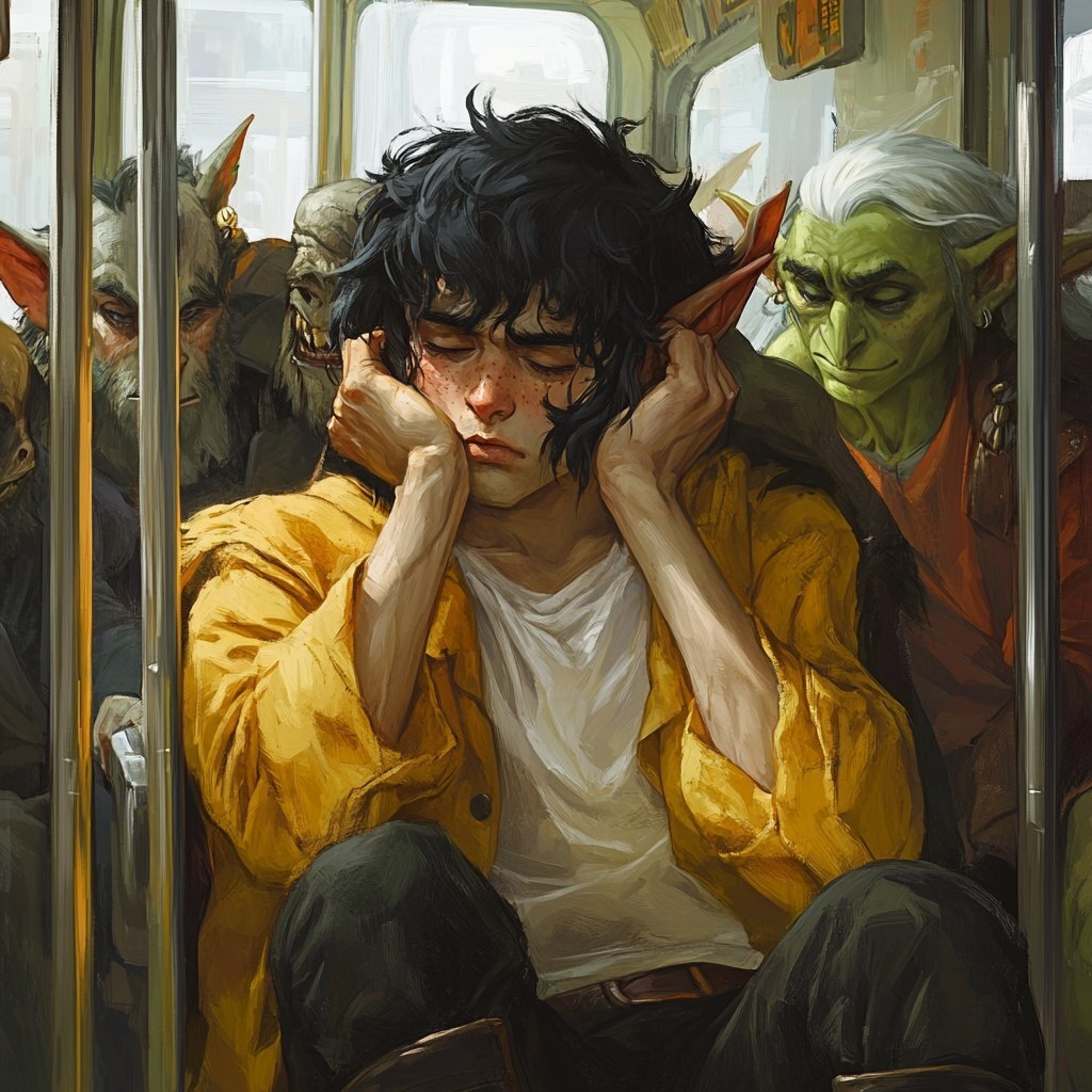 Создано на основе запроса: fantasy atyle artwork of a normal-looking 20 year old human with messy black hair covering their ears, riding the bus. Around him are elves, orcs, and goblins cramped together on the morning commute. He looks a little annoyed as he's squished close to everyone else. He wears nice modern clothes. Humorous, funny, relatable, light --- Автоперевод: Фэнтезийные художественные работы с нормальным 20-летним человеком с грязными черными волосами, покрывающими их уши, катаясь на автобусе. Хорошо получилось? 🤔 https://dzen.ru/id/65c0c65c86e4f837c27b24d7 #ИИ #AI #нейросеть #midjourney #art