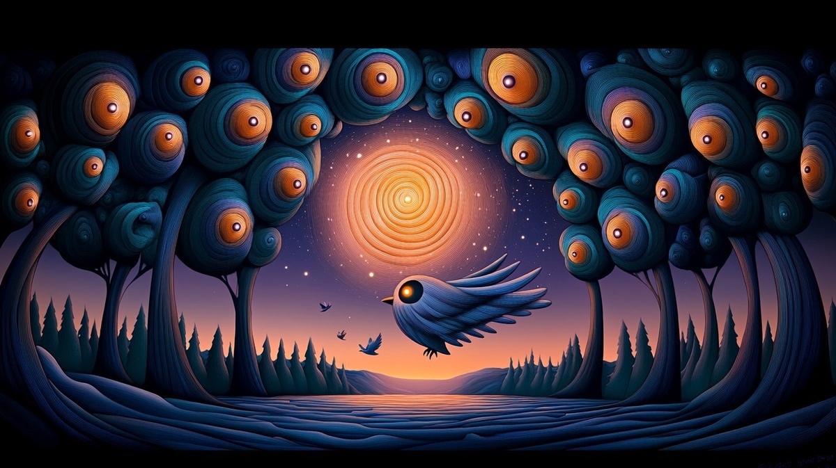 Создано на основе запроса: An enchanting nighttime setting with a group of fiber optic floral owls flying above a serene lake. Each owl has a unique design that emits soft, colorful lights. The lake reflects the vibrant colors of the owls, and the scene is framed by silhouetted trees against a starry sky, creating a magical atmosphere. --- Автоперевод: Очаровательная ночная обстановка с группой волоконно -оптических цветочных совы, летящих над безмятежным озером. Неплохо выглядит? 🤔 https://dzen.ru/id/65c0c65c86e4f837c27b24d7 #ИИ #AI #нейросеть #midjourney #art