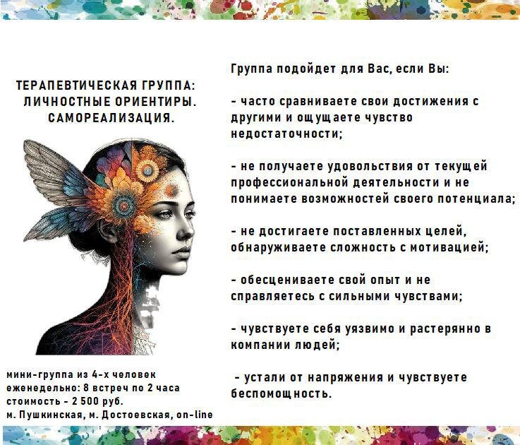 ТЕРАПЕВТИЧЕСКИЕ МИНИ-группы: 👧 Внутренний ребенок 😇 Эмоциональная НЕ-зависимость 🤓 Личностные ориентиры. Самореализация. Цикл из 12 еженедельных встреч по 2 часа Мини-группа из 4-х участников ❗️КРИТЕРИИ ДЛЯ УЧАСТНИКОВ ГРУПП - не менее 6-ти мес. личной психотерапии и / или участие в пролонгированных терапевтических группах (первичное знание особенностей своей структуры личности); - явное желание изменений и готовность к получению нового опыта; - вовлеченность в работу терапевтической группы, выполнение домашнего задания ❗️Что будет происходить на группе: - проработка личного материала в рамках предусмотренной программы; - обсуждение внутренних переживаний и проживание своих чувств; - упражнения в подгруппах и психотерапевтическая работа; - групповая динамическая работа; - арт - терапия и работа с ассоциативными карточками. ❗️ВОЗМОЖНОСТИ ПРОВЕДЕНИЯ ГРУПП: 1 группа: по ср. или чт. с 19:00 до 21:00 м. Пушкинская 2 группа: по пятницам с 11:00 до 13:00 On-line 3 группа: