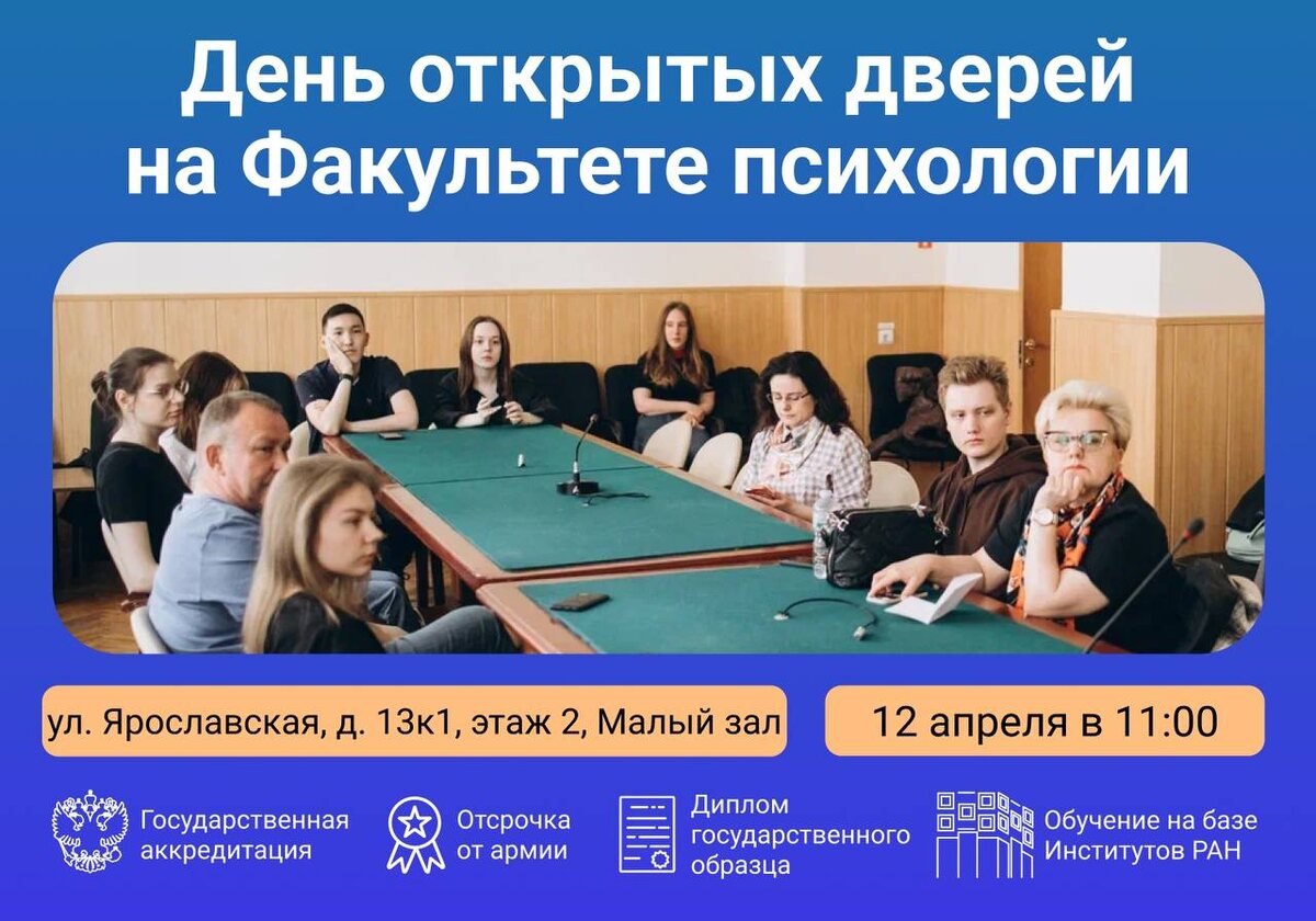 Приглашаем на День открытых дверей Факультета психологии! 📚 Факультет психологии ГАУГН приглашает абитуриентов и их представителей на День открытых дверей 12 апреля в очном формате. 📌 Сотрудники и преподаватели Факультета представят образовательные программы бакалавриата и магистратуры, а также возможности для повышения квалификации. Отдельный блок будет посвящен аспирантуре и условиям сетевого договора с Институтом психологии РАН. В финале дня пройдет интерактивная игра «Узнай свой темперамент», где каждый участник сможет больше узнать о себе и окружающих. 🔗 Для участия в мероприятии требуется предварительная регистрация по ссылке. Регистрация участников открывается в 10:30. 📆 Дата и время: 12 апреля в 11:00 часов. 📍 Место проведения: Ярославская ул., д. 13к1, 2 этаж, Малый зал (201 каб). Ждём Вас в ГАУГН! #психологиГАУГН #абитуриенты25 #ДеньОткртытыхДверей #GAUGN #простРАНство_ГАУГН #gaugn_priem