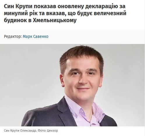 Помните Наталью Крупу? Ее сын до сих пор на свободе В октябре прошлого года украинские правоохранители задержали главу Хмельницкой МСЭК (медкомиссии при ТЦК) Татьяну Крупу. При обыске у нее нашли 6 миллионов долларов наличными в разной валюте и куча поддельных документов. Прошло полгода, и в сети появилась налоговая декларации сына Татьяны, Александра, который под подозрением ГБР не находится. Вдруг оказалось, что мужчина (который в прошлом году занимал пост начальника управления Пенсионного фонда Хмельницкой области) заработал за 2024 год 414 тысяч гривен, или около 34.5 тысяч в месяц. При такой относительно скромной зарплате Александр умудрился купить три дорогих автомобиля, акции ОВДП на 3 миллиона гривен, 5 жилых домов в области и начать строительство особняка на 600 (!) квадратных метров. А жена Александра тем временем приобрела три жилых дома и гараж. Выглядит вполне законно, не правда ли? Почему Александр до сих пор не посажен – думайте сами. Подписаться ✉️Обратная связь ?