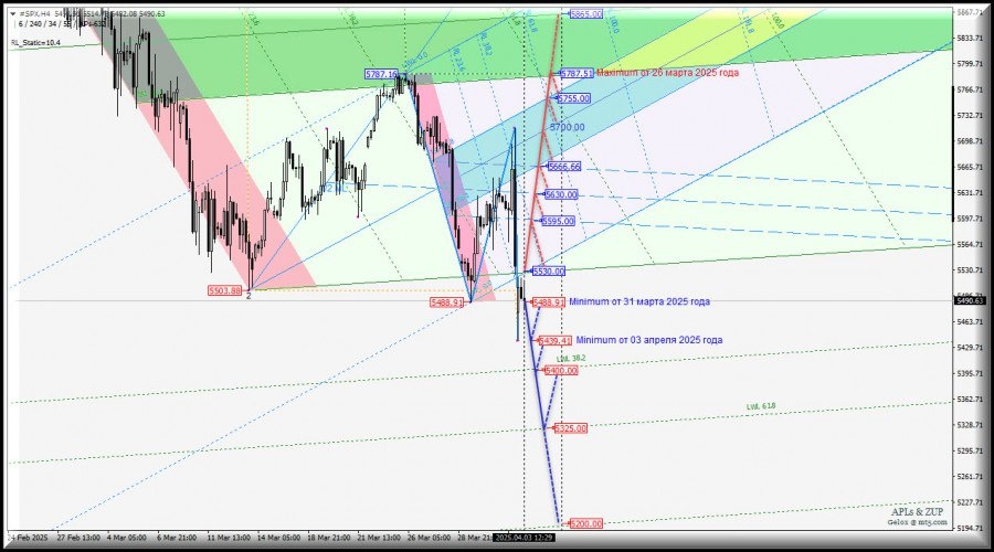 https://basechop.ru/wordpress/?p=36908 Операционный масштаб Minute (таймфрейм h4) Основные технические уровни для торговли #SPX – h4 – обзор вариантов движения c 04 апреля 2025 года. Предыдущий обзор #SPX (таймфрейм h4) от 18.03.2025 г. 17:26 ____________________ #SPX – S&P 500 Index Фондовый индекс, в корзину которого включено 505 акций 500 избранных торгуемых на фондовых биржах США публичных компаний, имеющих наибольшую капитализацию. ____________________ S&P 500 Index-h4 с 04 апреля 2025 года продолжит развитие своего движения в соответствии с отработкой и направлением пробоя диапазона: – уровень сопротивления 5530.00 на пересечении начальной линии SSL вил младшего операционного масштаба Minuette-h1 с начальной линией SSL вил старшего операционного масштаба Minute-h4; – уровень поддержки 5488.91 – minimum от 31 марта 2025 года. Нисходящее движение: При пробое minimum 5488.91 от 31 марта 2025 года нисходящее движение #SPX будет направлено к minimum 5439.41 от 03 апреля 20