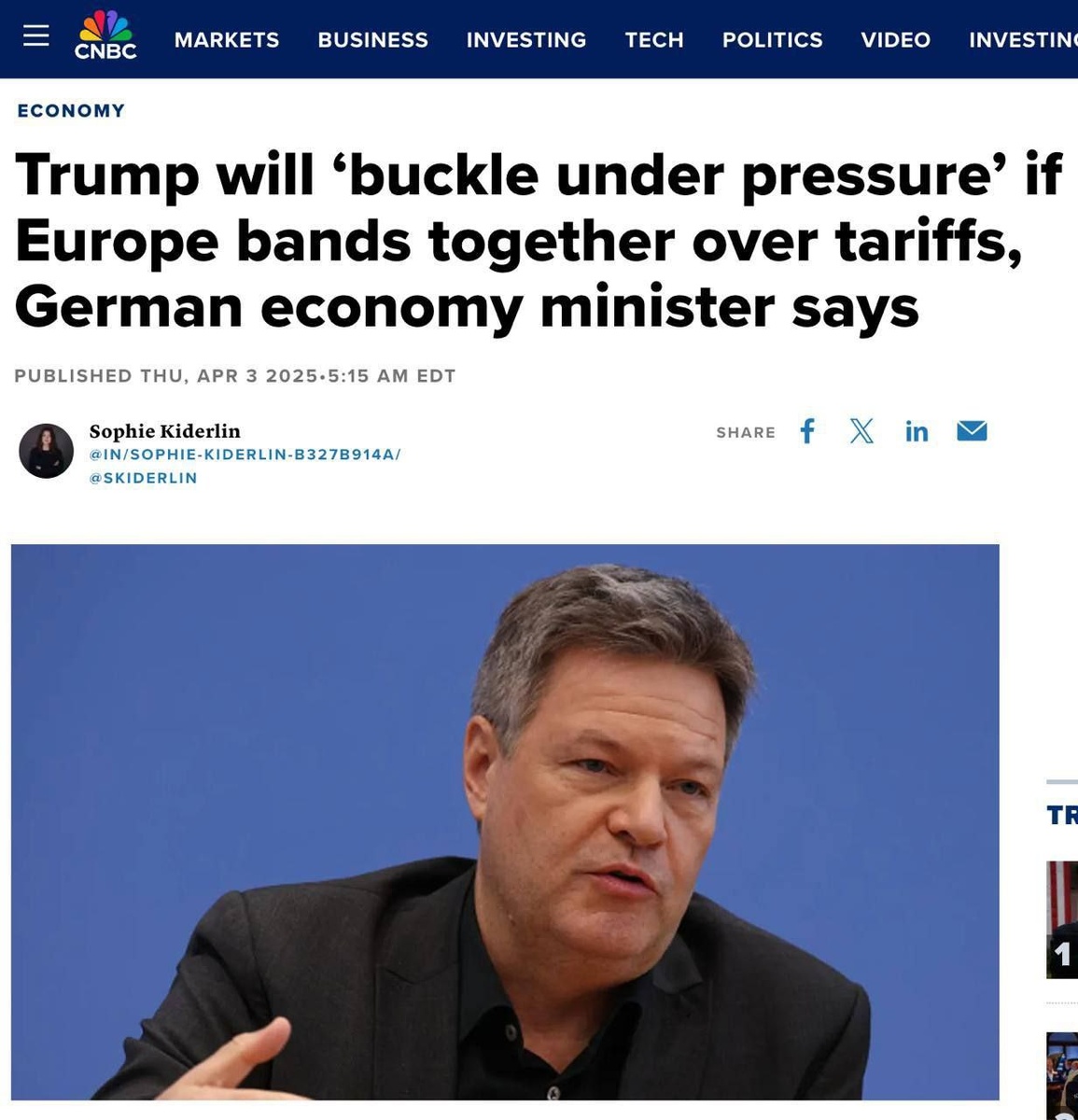 "Увидим, кто сильнее": Министр экономики Германии угрожает Трампу «Я вижу, что Дональд Трамп сдастся под давлением, что он скорректирует свои заявления под давлением, но логическим следствием этого является то, что ему также нужно будет почувствовать давление. И это давление теперь должно быть развернуто со стороны Германии, со стороны Европы в союзе с другими странами, и тогда мы увидим, кто сильнее в этом армрестлинге», — заявил CNBC Роберт Хабек, Главное не останавливайтесь! Болеем за обе команды „Mal sehen, wer stärker ist“: Deutscher Wirtschaftsminister droht Trump „Ich sehe, dass Donald Trump unter Druck einknicken wird, dass er seine Aussagen unter Druck anpassen wird, aber die logische Konsequenz daraus ist, dass er auch Druck spüren muss. Und dieser Druck muss jetzt von Deutschland ausgehen, von Europa im Bündnis mit anderen Ländern, und dann werden wir sehen, wer in diesem Armdrücken stärker ist“, sagte Robert Habeck gegenüber CNBC. Hauptsache, nicht aufhören! Wir u