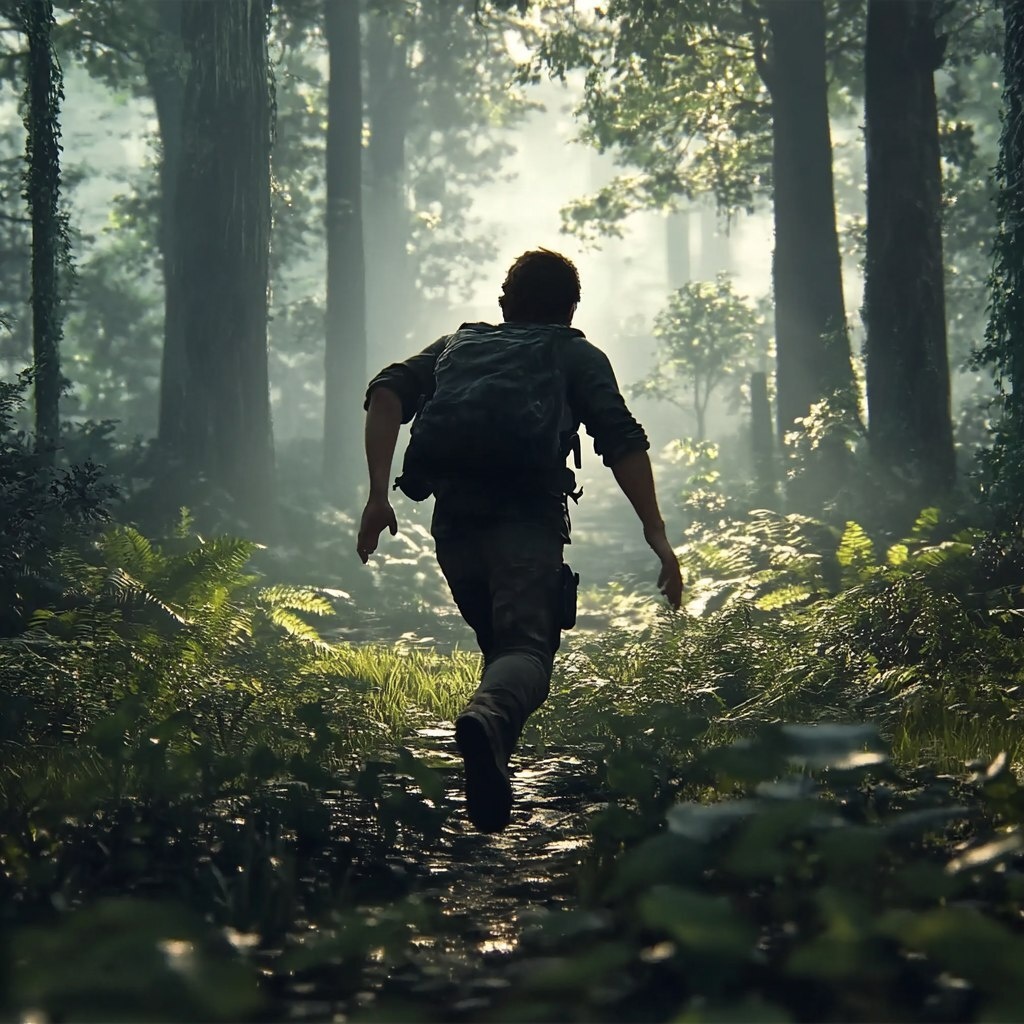 Создано на основе запроса: man in an emersive ps5 video game running through a forest, game graphics, ps5, last of us