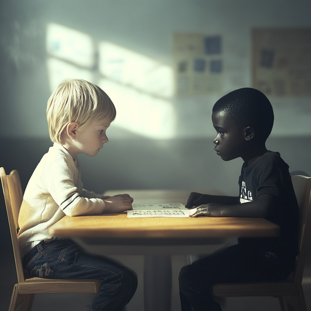 Создано на основе запроса: a white kid playing a black kid in school,realsitic,4k
