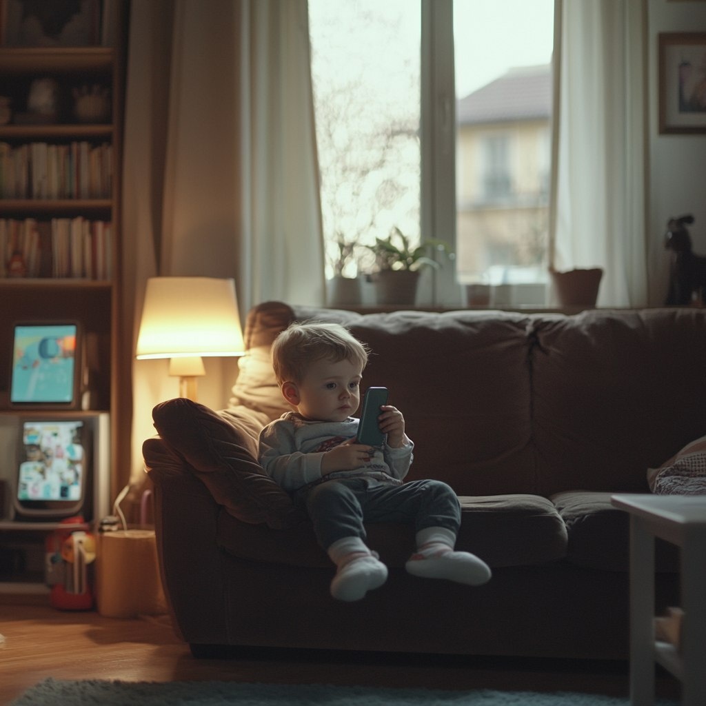 Создано на основе запроса: a little boy talking on the cell phone in his living room,realistic, 4k