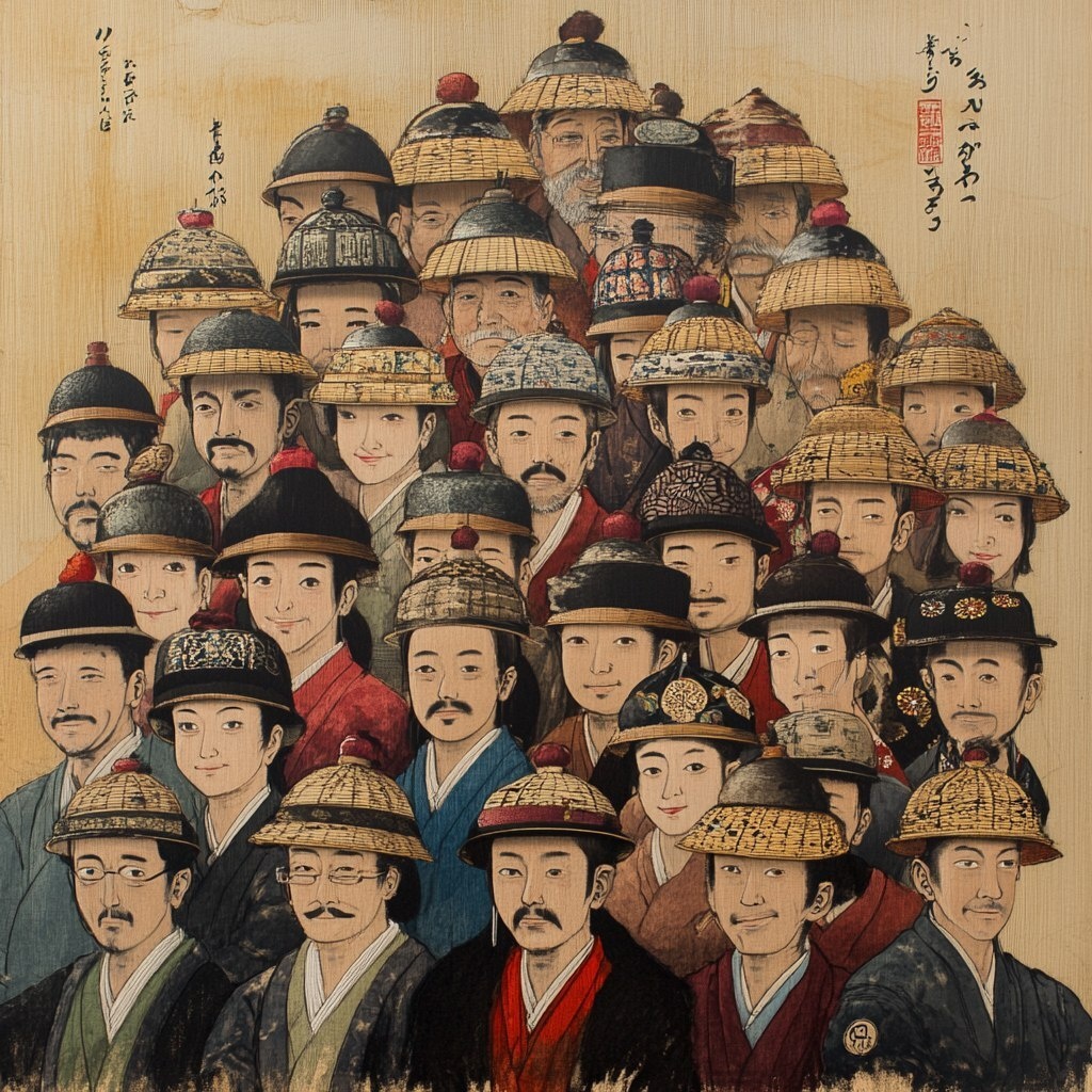 Создано на основе запроса: a picture group of one hundred japanese people wearing an hat made in the style of the Florentine dome, portrait