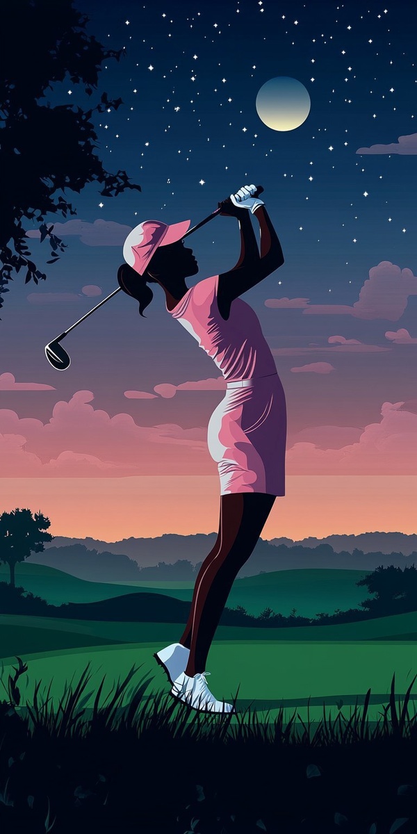 Создано на основе запроса: A silhouette of an athletic African American woman in stylish pink and white golf attire, swinging her club with precision. The backdrop features lush green grass and rolling distant hills beneath a serene, starlit sky. The scene exudes tranquility and elegance, capturing the beauty of nighttime golfing. Illustrated in the style of Michael Page. --- Автоперевод: Силуэт спортивной афроамериканской женщины в стильной розовой и белой одежде для гольфа, с точностью размахивать ее клубом. Необычно вышло? 🤔 https://dzen.ru/id/65c0c65c86e4f837c27b24d7 #ИИ #AI #нейросеть #midjourney #art