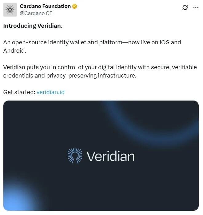 πΈΠ€ΠΎΠ½Π΄ Cardano ΠΎΠ±ΡΡΠ²Π»ΡΠ΅Ρ ΠΎ Π·Π°ΠΏΡΡΠΊΠ΅ Veridian β ΠΏΠ»Π°ΡΡΠΎΡΠΌΡ ΡΠΈΡΡΠΎΠ²ΠΎΠΉ ΠΈΠ΄Π΅Π½ΡΠΈΡΠΈΠΊΠ°ΡΠΈΠΈ Ρ ΠΎΡΠΊΡΡΡΡΠΌ ΠΈΡΡ ΠΎΠ΄Π½ΡΠΌ ΠΊΠΎΠ΄ΠΎΠΌ Π΄Π»Ρ ΡΠ°ΡΡΠ½ΡΡ Π»ΠΈΡ ΠΈ ΠΎΡΠ³Π°Π½ΠΈΠ·Π°ΡΠΈΠΉ