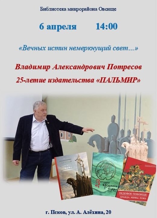 Псковичей приглашают на встречу с писателем Владимиром Потресовым. Она состоится 6 апреля в 14:00 в библиотеке микрорайона Овсище. Мероприятие будет посвящено 25-летию издательства "Пальмир", руководителем которого является писатель, журналист, путешественник, исследователь, один из авторов "Музея Ледового побоища. Самолва" Владимир Потресов. Фото: библиотека микрорайона Овсище