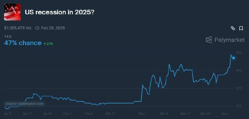 🔸Пользователи Polymarket в настоящее время оценивают вероятность рецессии в США в этом году в 47%.