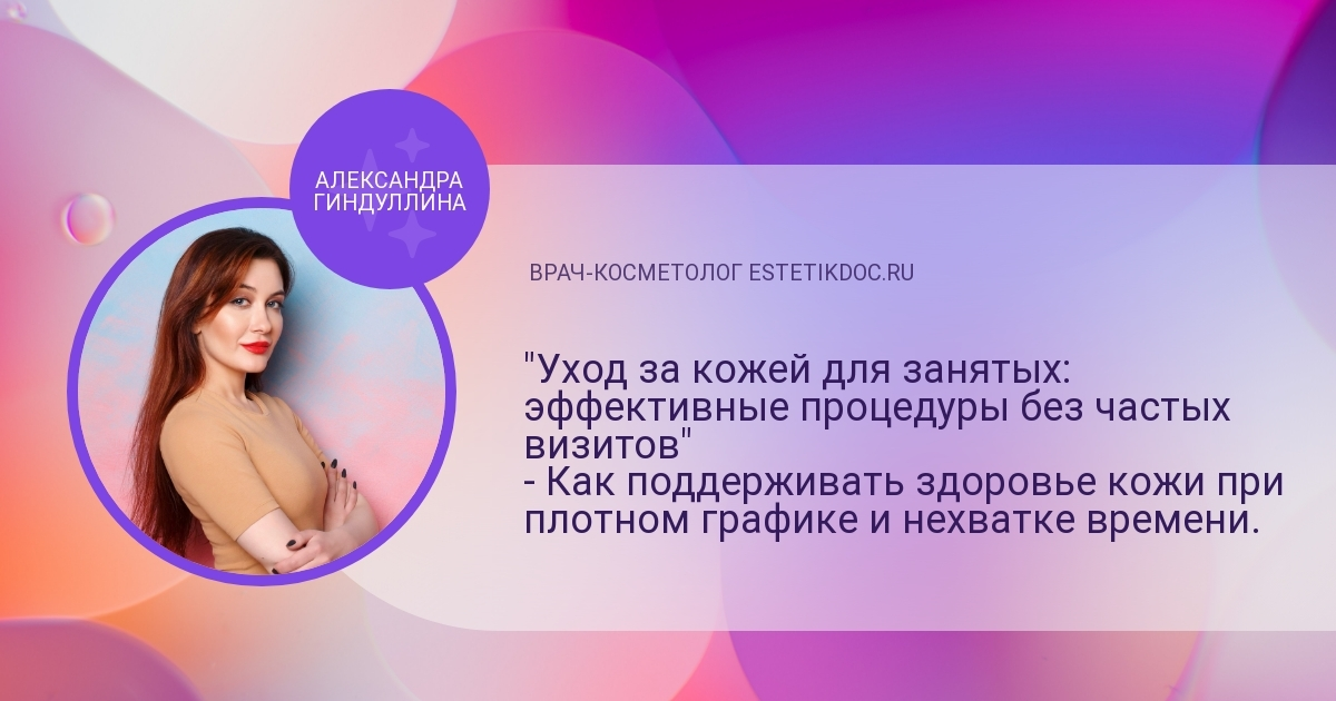 Здравствуйте, уважаемые читатели. Меня зовут Александра Гиндуллина. Я являюсь врачом-косметологом и хирургом, специализирующимся на эстетической медицине. В сегодняшней статье познакомлю вас с рекомендациями по уходу за кожей, которые будут особенно полезны в условиях напряженного графика и недостатка времени. При высокой занятости одной из самых сложных задач становится правильный выбор средств для ухода за кожей. Когда каждая минута на счету, важно учитывать не только эффективность, но и многофункциональность косметических продуктов. Они способны существенно упростить рутинный уход, позволив сэкономить время. Регулярность ухода важнее его длительности. Вот несколько практических советов по организации процедуры ухода: Правильное очищение и увлажнение являются основными шагами в любой уходовой рутине. Они служат фундаментом для поддержания здоровья кожи: Для улучшения и продления результатов рекомендую рассмотреть процедуры комплексного ухода. В зависимости от вашего типа кожи и её с