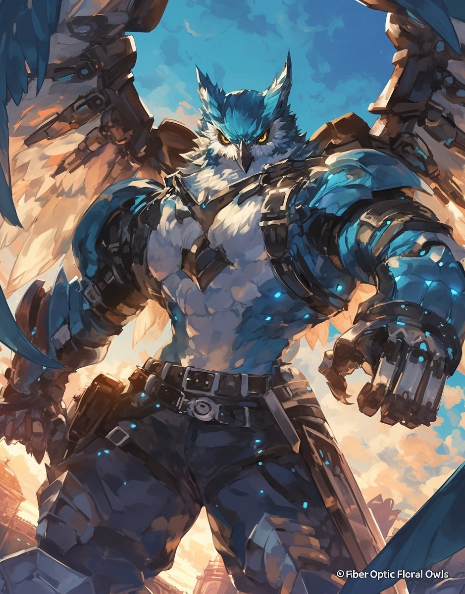 Создано на основе запроса: A mecha owl, Spread wings Gothic Fantasycore Witchblade suit, light blue and white, Interstellar Owlbear Ultimate Form, fluid metal vest, Bodybuilder, Super Hero "Fiber Optic Floral Owls" + exagerated venom like, very muscular, atomic chest, super hero, character portrait, vivid art style, at sunset