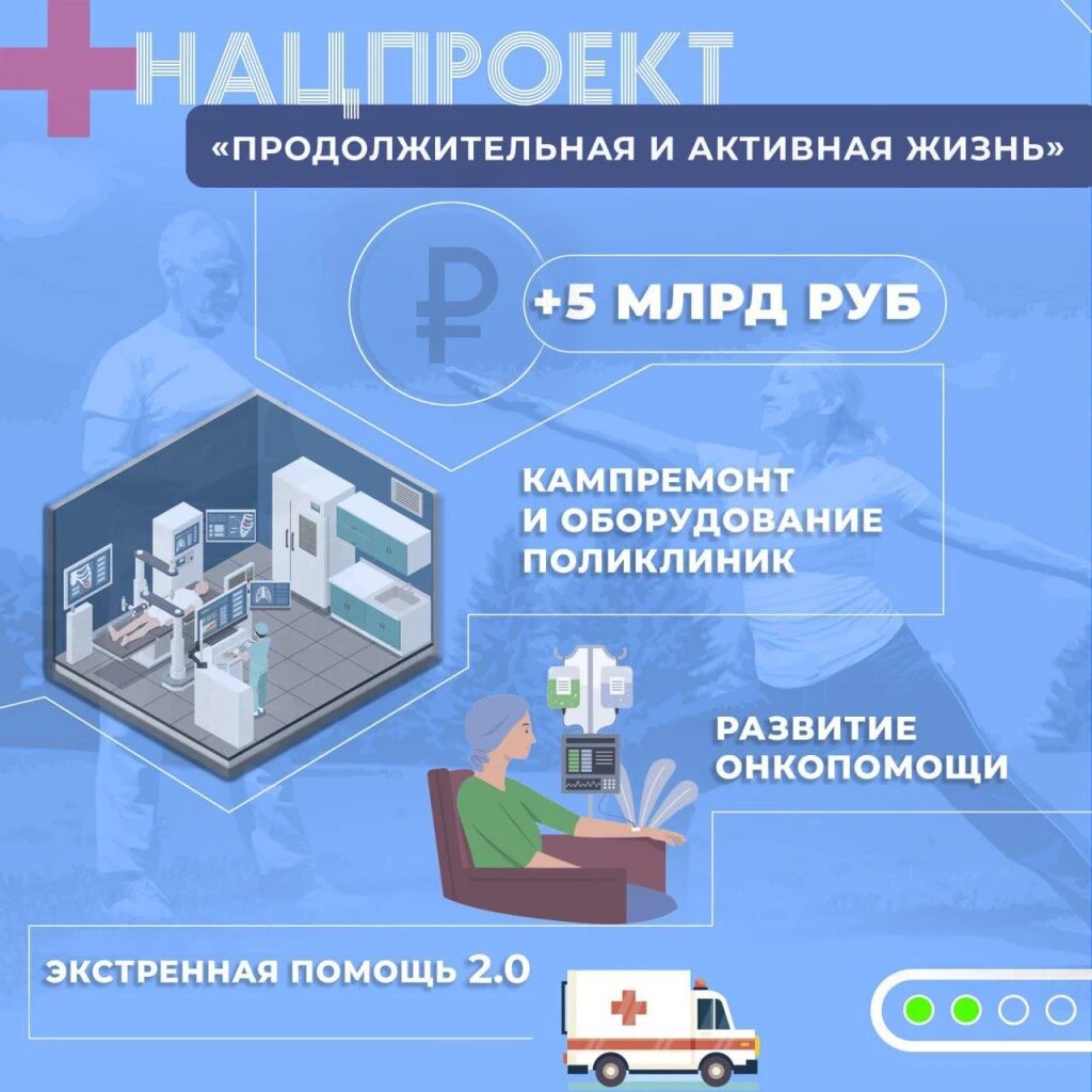 Самое крупное финансирование по национальному проекту «Продолжительная активная жизнь» – 5 млрд рублей на улучшение поликлиник и обновление материальной базы.