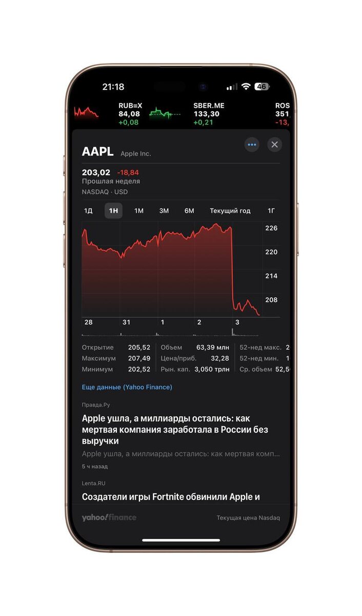 В США открылись торги и на фоне новостей о новых пошлинах, Apple теряет 20 пунктов.