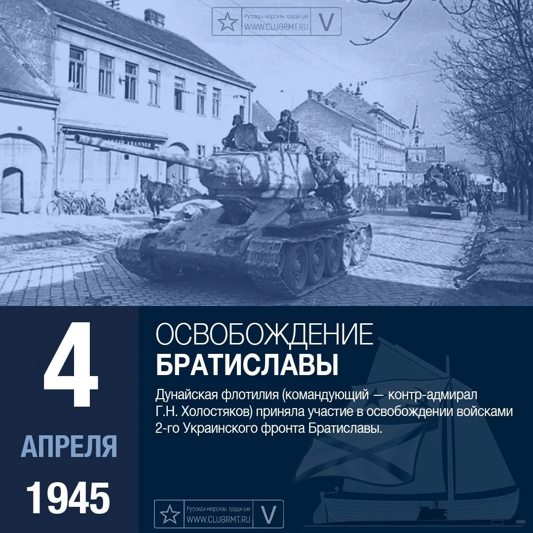 Откорректированная версия публикации о событиях этого дня в отечественной морской истории: 4 апреля - этот день в отечественной морской истории. 80 лет - 1945, 4 апреля: Завершилась Восточно-Померанская наступательная операция. Войска 2-го Белорусского и 1-го Белорусского фронтов при содействии Балтийского флота, разгромив группировку противника, вышли к Балтийскому морю. 80 лет - 1945, 4 апреля: Дунайская флотилия (командующий - контр-адмирал Г.Н. Холостяков) приняла участие в освобождении войсками 2-го Украинского фронта Братиславы. 80 лет - 1945, 4 апреля: Последний выход подводных лодок Северного флота (подводная лодка «В-3» под командованием капитана 3 ранга И.С. Кабо) на боевое задание в годы Великой Отечественной войны. 105 лет - 1920, 4 апреля: Отряд судов белых в составе 10-13 вымпелов высадил десант в 800 штыков у Кириловки в 11 милях к северо-западу от острова Бирючий (Азовское море). Десант был разбит и в беспорядке отступил на суда. 225 лет - 1800, 4 апреля (23 марта по с