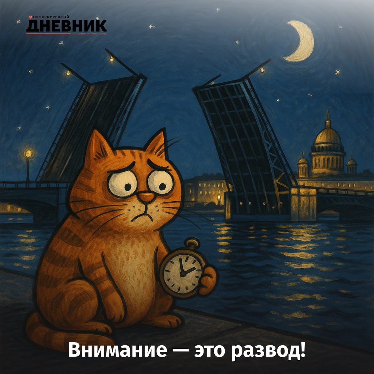 🌉 Изменения в графике разводки мостов в ночь на 4 апреля В ночь с 3 на 4 апреля в Петербурге будет изменен график технических разводок мостов в связи с плановыми работами по обслуживанию мостовых конструкций. Время разводки для ключевых мостов города будет следующим: 🔸 Мост Александра Невского: 02:20-05:10 🔸 Троицкий мост: 01:20-04:50 🔸 Дворцовый мост: 01:10-04:55 🔸 Благовещенский мост: 01:25-05:00 🔸 Биржевой мост: 02:00-04:55 🔸 Гренадерский мост: 01:30-04:30 Фактическое время разводки и наводки может быть меньше, а актуальную информацию можно получить в реальном времени через сайт и мобильное приложение «Мосты Петербурга». Фото: DALL-E Петербургский дневник