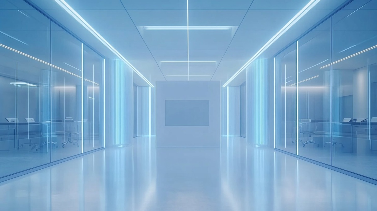 Создано на основе запроса: Modern AI company office interior, sleek minimalist design, floor-to-ceiling windows with natural light, clean white walls with one blank feature wall for logo placement, glass conference room, high-tech workstations, subtle tech elements, blue accent lighting, open floor plan, no people, bright and airy atmosphere, approachable yet professional, ultra-realistic photography style, 4K, crisp details