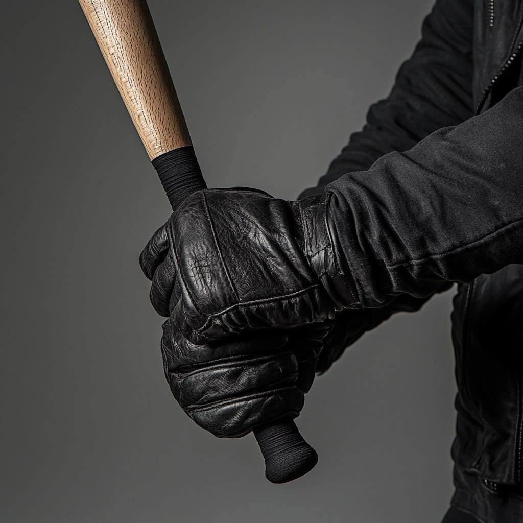 Создано на основе запроса: a man wearling black leather gloves holding a bat ready to swing, urban fantasy style image on a gray background