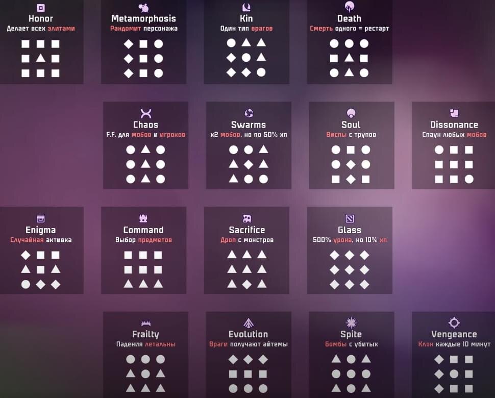 Артефакты - это игровые модификаторы, которые могут кардинально изменить некоторые аспекты игрового процесса. Большинство кодов артефактов можно найти на прямоугольных каменных табличках, разбросанных по уровням, которые нужно ввести в специальном событии, чтобы разблокировать соответствующий артефакт. Как только Артефакт разблокирован, игрок может активировать его в начале нового забега. В многопользовательской игре артефакты, разблокированные всеми игроками в лобби, объединяются; команда может включить или выключить любой артефакт, который был разблокирован любым из членов группы. Чтобы разблокировать артефакт, игрок должен ввести код артефакта на карте Sky Meadow с помощью генератора соединений под картой, а затем взаимодействовать с ноутбуком. Откроется портал к испытанию этого артефакта в Bulwark's Ambry. Генератор соединений также можно найти на карте Helminth Hatchery, альтернативной карте пятого этапа. Входы генератора соединений будут циклически повторяться в следующем порядк