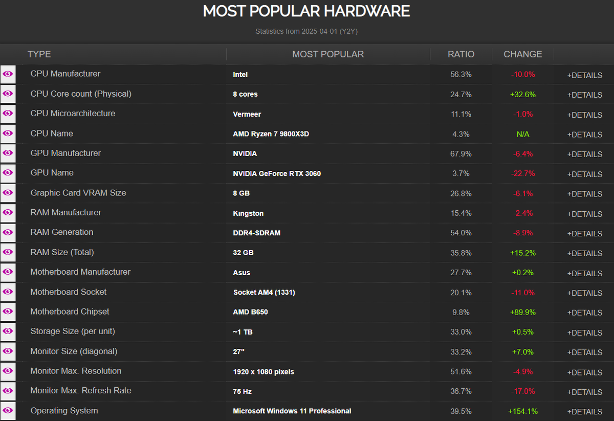 CPU-Z, известный агрегатор для отслеживания информации о своем компьютере, в частности о процессоре, каждый квартал публикует статистику о пользователях. CPU-Z собирает статистику о процессорах, материнских платах и оперативной памяти пользователей через встроенную функцию в программе. Недавно были опубликованы данные по статистике за первый квартал 2025 года. По данным CPU-Z, самыми популярными процессорами на данный момент являются модели с восемью физическими ядрами. Они составляют 24.7% среди всех пользователей, пользующихся программой. AMD становится все более популярным выбором для покупки процессора. На данный момент они имеют долю 43,7%, что на 16,6% больше, чем в прошлом году. Доля Intel упала на 10% и составляет 56,3%. Самым популярным процессором является Ryzen 7 9800X3D, которым владеют 4.3% пользователей. Топ процессоров выглядит следующим образом: По видеокартам ситуация следующая: NVIDIA владеет долей 67.9%, что на 6.4% меньше, чем годом ранее, а AMD обладает 31.5%, увел