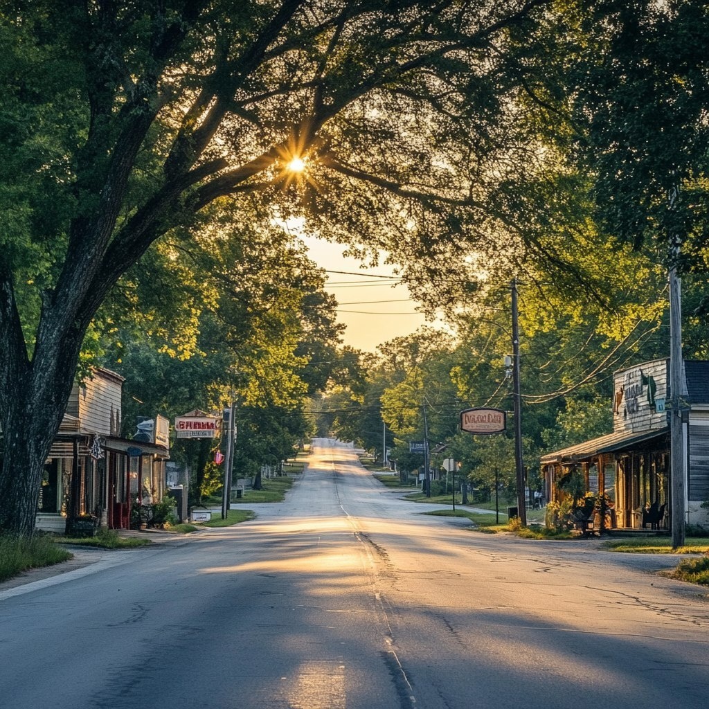 Создано на основе запроса: a photo of a small town road nearing dusk with a sunset. there are trees and a few old store fronts. award-winning lighting. ar16:9