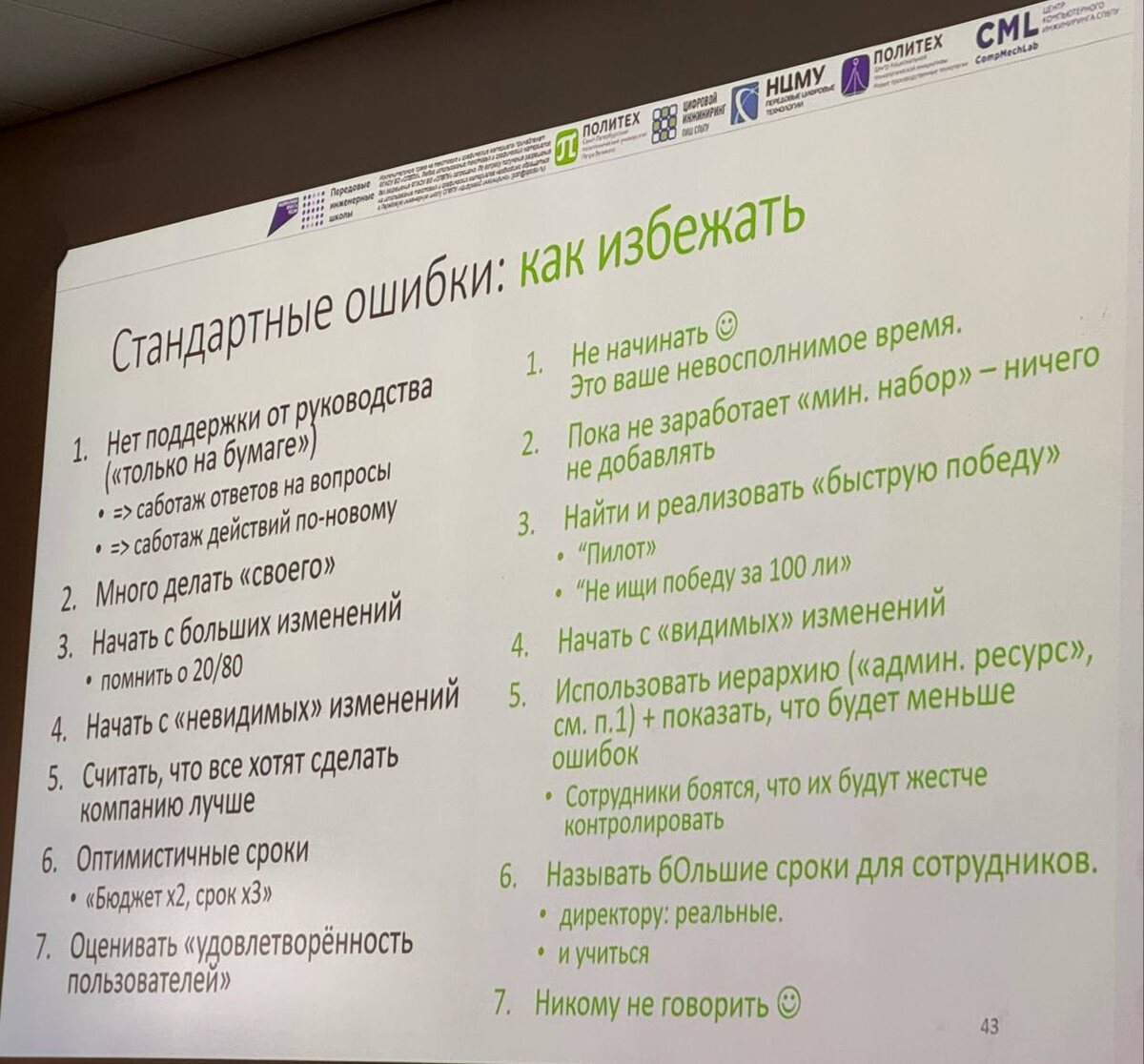 Не могла не поделиться слайдом с лекции по внедрению изменений (сюда же внедрение новых it-систем). Из всех ошибок я наверно только удовлетворенность пользователей не оценивала сразу после внедрения изменений) Поэтому рекомендую к внимательному прочтению, действительно практические советы.