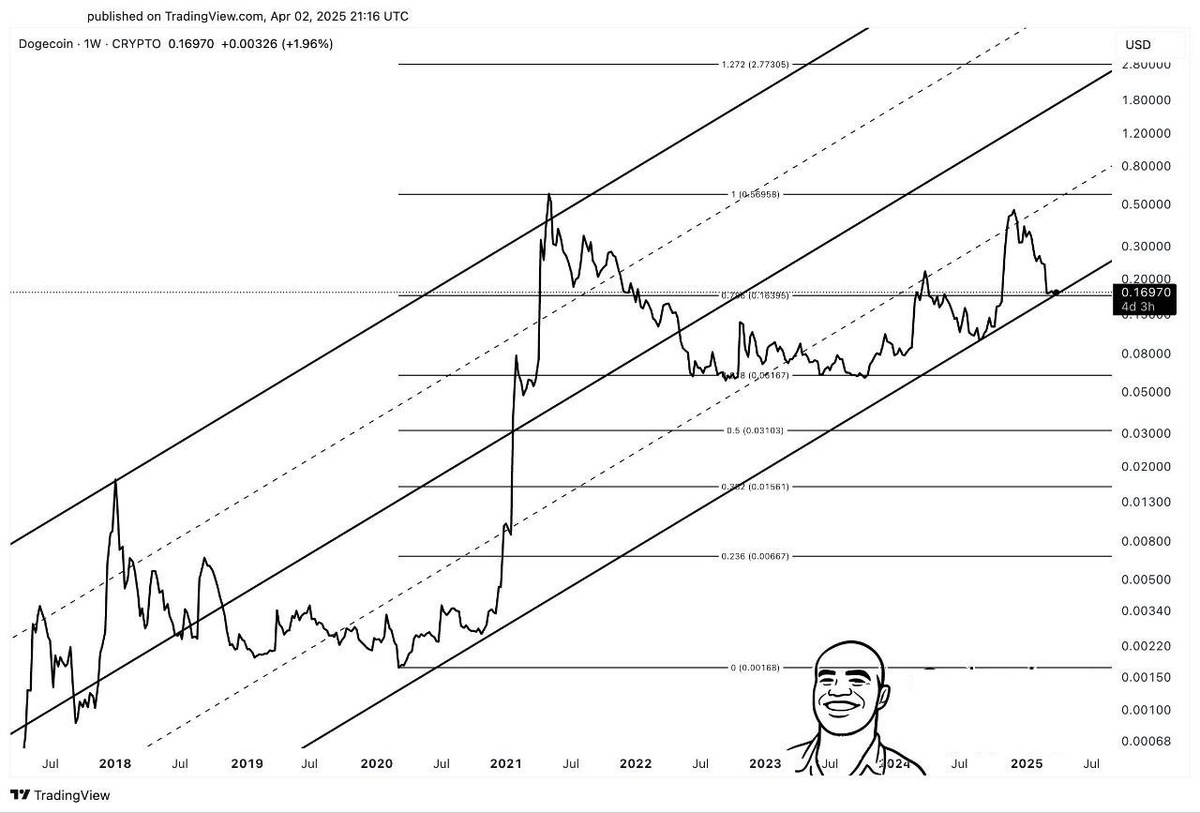 DOGE может упасть до $0,06 😭 Трейдер Али считает, что если уровень канала $0,16 не удержится – токен может упасть до $0,06. Но есть и хорошие перспективы: если уровень удержится – будет ралли до $0,57, а конечная цель может быть $3.